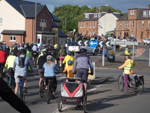 Photo caption: What it’s all for! Good governance means we can take part and help organise events such as the Dumfries town ride out for Guid Nychburrris 2024. Secretary Rhian ensures participants take the correct route round the roundabout.