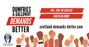 Join us to hear about the Scotland Demands Better and campaign and how you can get involved! Organised in partnership with Third Sector Dumfries & Galloway.